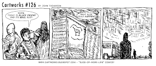 Finished drawing this strip late last night, but didn't scan in and letter it till today. Didn't realize how quick it would be to finish the rest in the computer. Speaking of comics, I went to the SF show "APE" yesterday and had a good time. I found an empty table and was able to get an exhibitors badge and had a set-up of my comics and sketchbooks for sale. Sold a few comics but still a fun time and next year I should be prepared for the show.